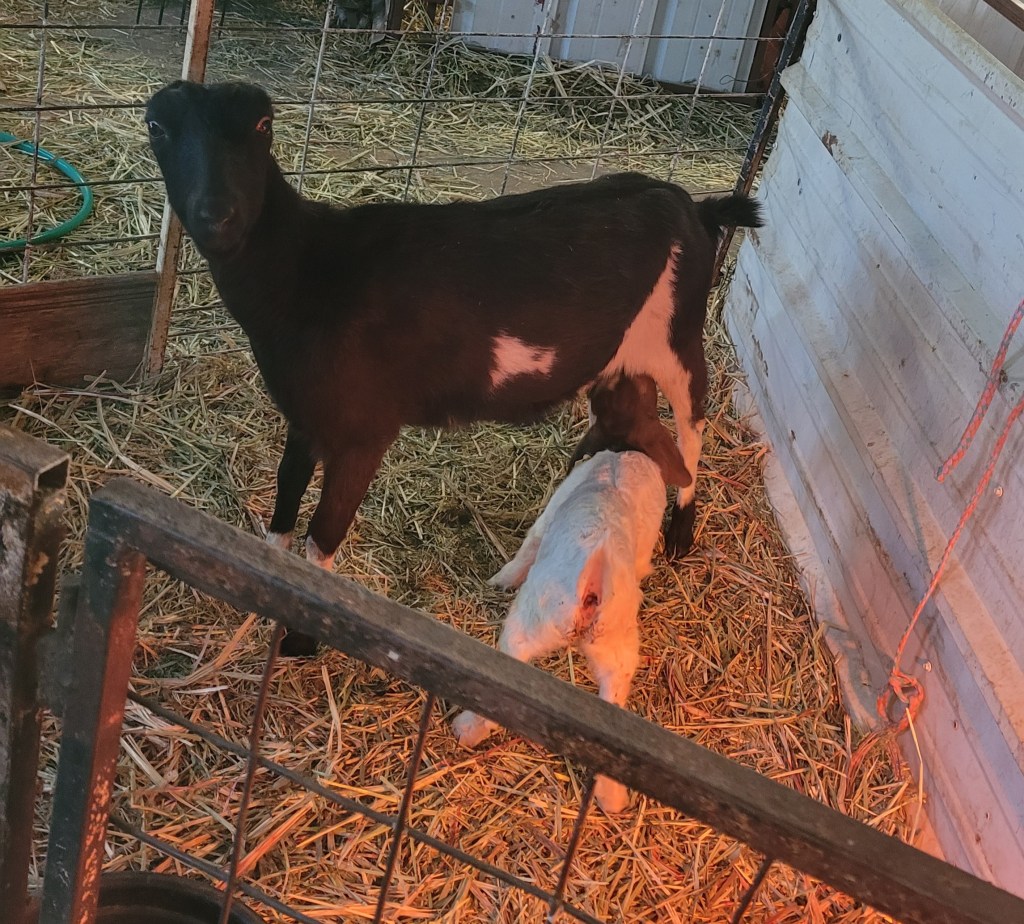 If this image looks a little strange to you, it’s because it is. We raise a breed of goats that are called Boer (they are the ones with white bodies and red heads typically). However, we also have a handful of Lamancha dairy goats that we inherited with some of the Boers that we purchased a few years ago. Lamanchas are an interesting breed of goat because they are some of the most gentle, even tempered goats you will ever meet. The drawback is that they are ugly as sin because they have no ears and they are not really a market animal (which is what we are in the business for). Well, this particular black and white Lamancha, Oreo, is such a sweetheart. Unfortunately, she had a hard time giving birth to her very first baby last weekend and ended up delivering a stillborn, that my husband had to help pull. Rather than her finding out that her kid didn’t make it, I quickly grabbed my little bottle baby, Buck, so that we could try to graft him onto her.